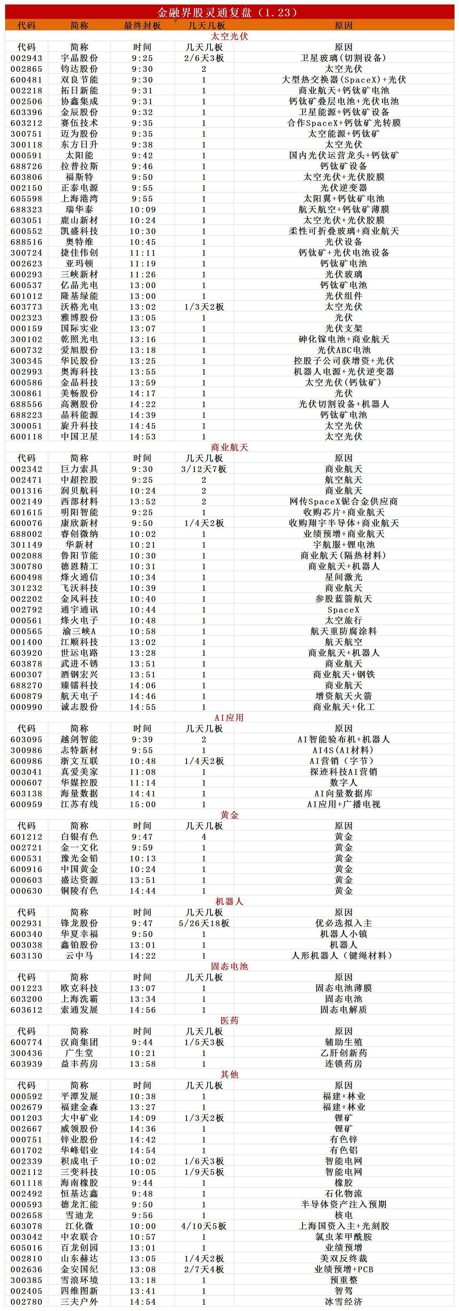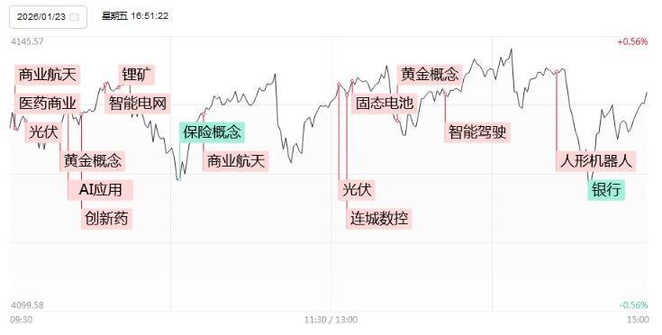 1月23日,指数尾盘震荡拉升,深成指探底回升,创业板指、深成指均涨超0.5%,北证50指数大涨超3%。沪深两市成交额3.09万亿,较上一个交易日放量3935亿。盘面上,市场热点快速轮动,全市场超3900只个股上涨,120只股票涨停。从板块来看,光伏概念爆发,隆基绿能、钧达股份、协鑫集成、明阳智能、拓日新能等30余股涨停。商业航天概念反复活跃,十余只成分股涨停,金风科技、润贝航科、西部材料涨停。AI应用概念走高,浙文互联4天2板。贵金属概念延续强势,白银有色4连板,中国黄金、豫光金铅涨停。医药商业概念表现活跃,益丰药房涨停。下跌方面,保险、银行板块跌幅居前。截至收盘,沪指涨0.33%,深成指涨0.79%富牛网,创业板指涨0.63%。
